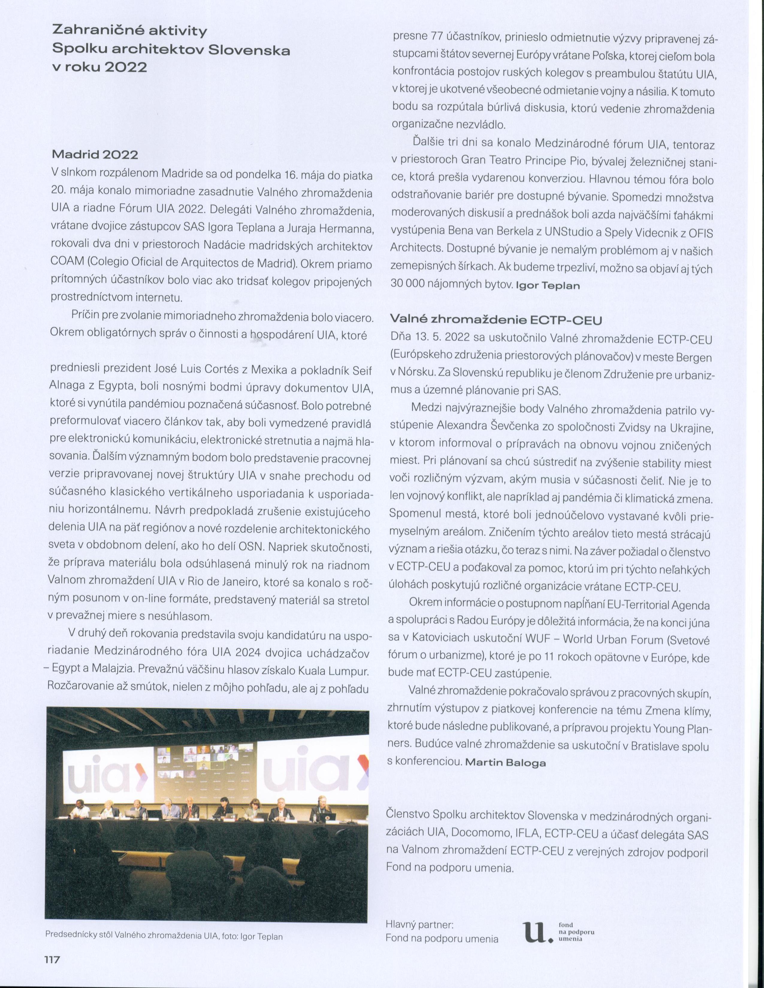 Člesnké príspevky Spolku architektov Slovenska v medzinárodných organizáciach UIA, IFLA, ECTP-CEU a docomomo z verejných zdrojov podporil Fond na podporu umenia.