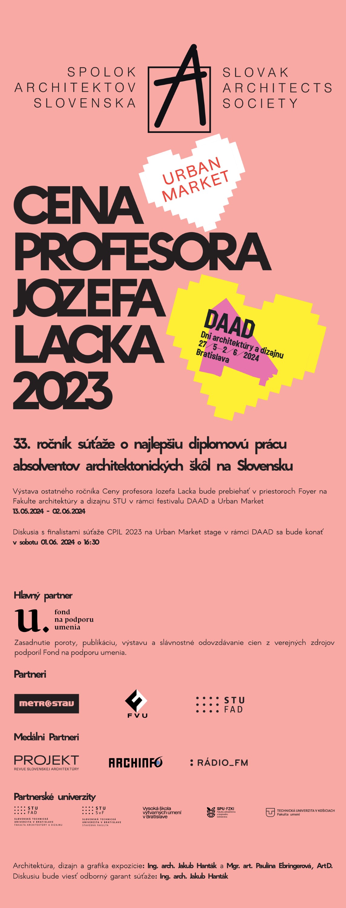 Výstava ostatného ročníka Ceny profesora Jozefa Lacka bude prebiehať v priestoroch Foyer na Fakulte architektúry a dizajnu STU v rámci festivalu DAAD #mladí a Urban Market: 13.05.2024 - 02.06.2024