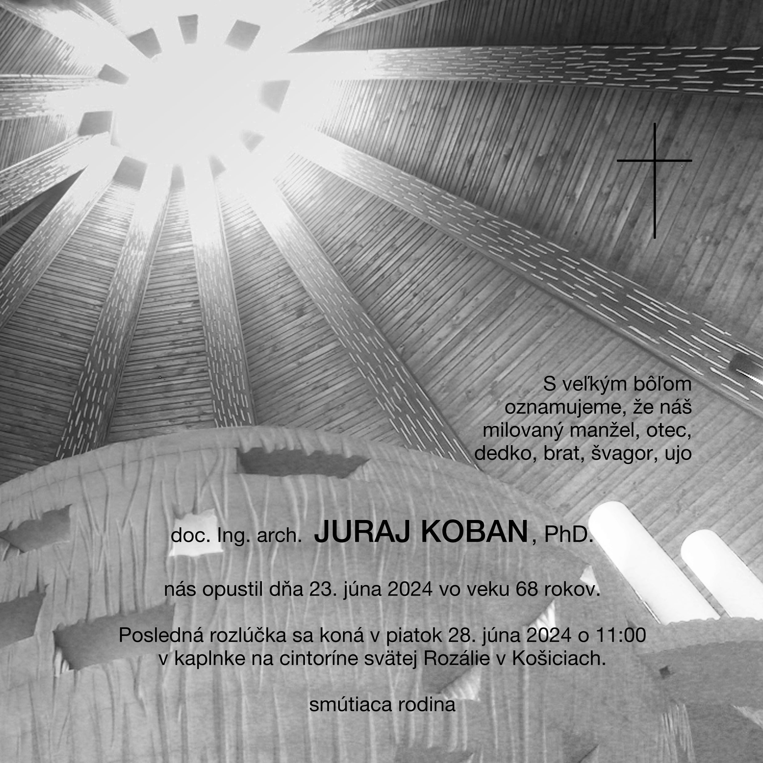 So zármutkom oznamujeme, že dňa 23. júna nás opustil doc. Ing. arch. Juraj Koban, PhD. vo veku 68 rokov.